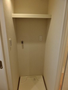 洗濯機置場の上部には棚があるので、カーテンをかけて、キレイに収納しましょ♪