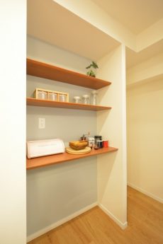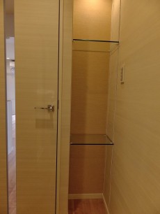 リビングに通じるドアの手前にガラスの棚がありました☆ただ収納するというより、オシャレに活用したい棚ですね(*^^)v