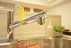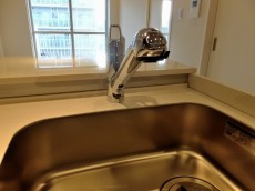 水栓は浄水機能付きシャワー水栓。切替えるだけで美味しいお水が出てくるなんて、いい時代になりました。縛られていて確認出来ませんでしたが、ヘッドが伸びるはずです。シンクを洗ったりに便利なんですよね。