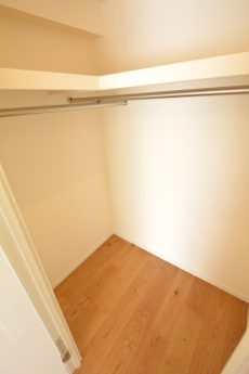 収納は約1帖のウォークインクローゼット。L字型にハンガーポールが設置されています。床面が広いので大きなスーツケースなども楽勝ですよ。