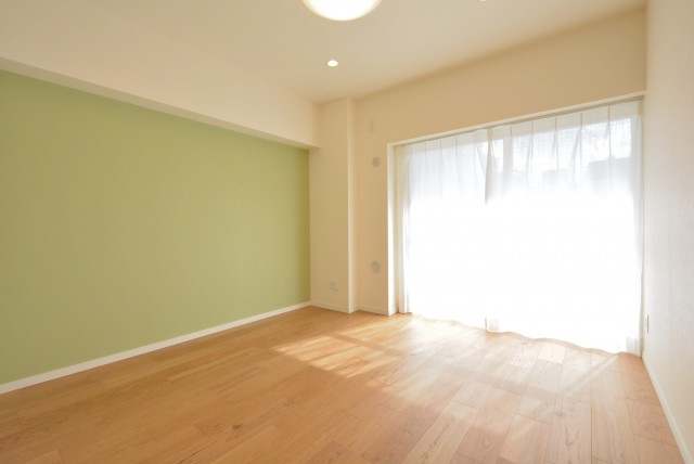 こちらは約6.8帖の洋室。パステルグリーンのアクセントクロスが印象的です。バルコニーに面した窓からは眩しい光が射し込んでいて、とても明るいお部屋ですね。