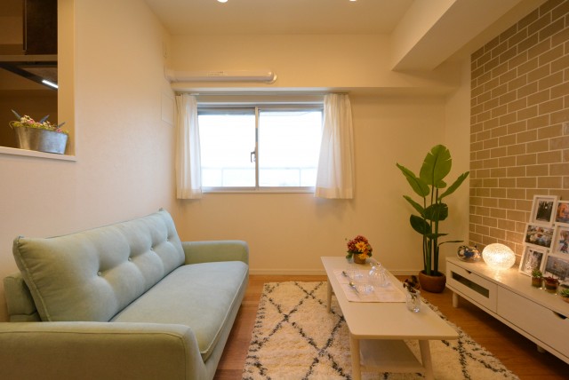窓際のリビング部分にはアクセントとしてタイルが貼られていて、お洒落なコーナーになっています。