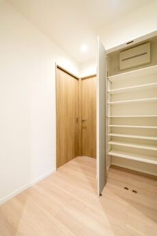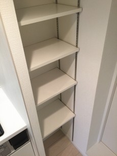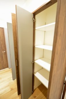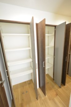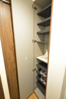 通路右側にずらりと並んだ3つの扉は、全て収納棚になっていました。かなりの収納力!棚は可動式なので、掃除機などの背の高い物も入れる事が出来そうです。