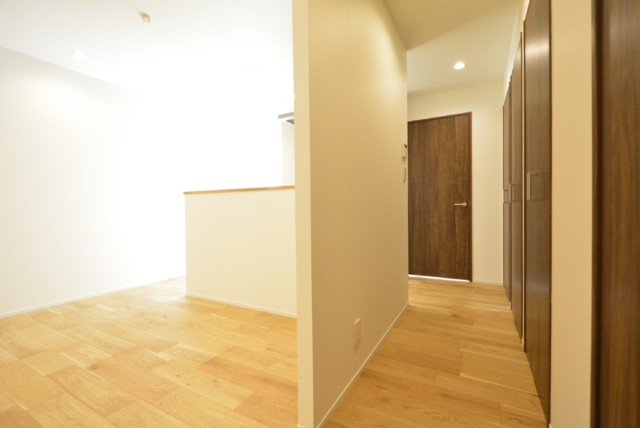 玄関を入ると、廊下というよりホールと呼んだ方がしっくりくるスペースになっています。玄関照明には人感センサーが付けられ、自動的にライトを点けてくれるので暗い中スイッチを探す必要もありません。両手が塞がっている時などほんと有難いですよね。シューズボックスは収納力のあるトールタイプ。可動式の棚を調節すればヒールやブーツなどでもそのまま収納出来ますよ。