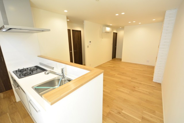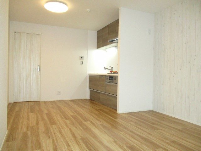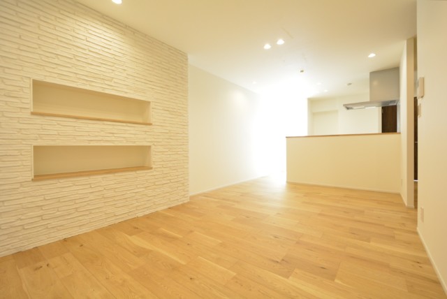 こちらは約18.7帖のリビング・ダイニング・キッチンです。木目を生かしたフローリングと白のクロスのナチュラルな雰囲気、縦長でレイアウトしやすそうなお部屋です。リビング部分にはレンガ風のアクセントとニッチカウンターでゾーンニング。色を増やさない控えめなアクセントが上品な感じですね。
