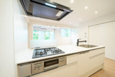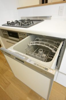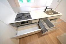 キッチンはカウンタータイプ。開放的で、お料理中でもリビングダイニングとコミュニケーションをとりやすいのが特徴です。白を基調にしたシステムキッチンはお部屋との統一感もバッチリ。洗い物は食器洗浄乾燥機にお任せして、食後はみんなでのんびりしちゃいましょう♬
