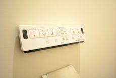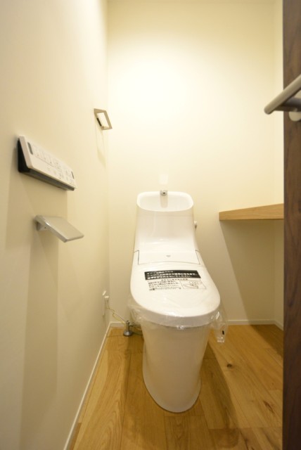 トイレはTOTO製の洗浄機能付き。トイレットペーパーや掃除道具を入れておくのに便利な吊戸棚も付いています。