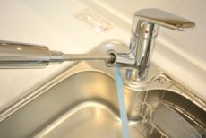 水栓は浄水機能付きシャワー水栓。切り替えるだけで気軽に美味しいお水を使えます。ヘッドが伸びるので、シンクを流したりにも便利ですよ。