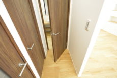 通路正面のドアは洗濯機スペース。大きな窓付きですので湿気が籠る事もありませんね。
