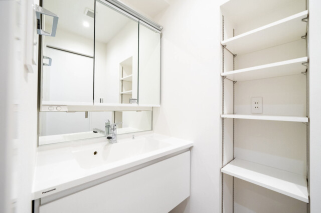ミラー横にはシャンプーなどのボトルもキレイに並べて置ける棚があり、清潔感のある空間を保つことができます♪♪