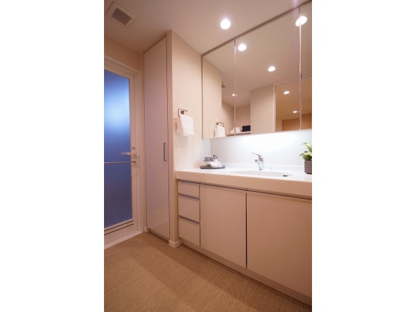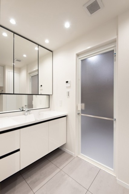 洗面室には洗面化粧台の他に、洗濯機スペース、浴室がまとまっています。洗面化粧台は身だしなみを整えるのに便利な三面鏡付き。裏がキャビネットになっているので、洗面周りに散らかりがちな細々したものもスッキリと片付けることができますよ。洗濯機スペースにも吊戸棚が付いているので、洗剤や洗濯ネットなどの洗濯グッズはこちらへどうぞ。