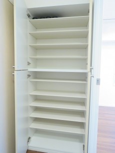 廊下正面の扉はシューズBOX。トールサイズで収納量もたっぷり!一人分の靴ならすっぽりこの中に納まるのではないでしょうか。
