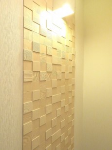壁面には玄関と同じくエコカラットがついています。上のスポットライトと組み合わせてオシャレな空間を演出しています。