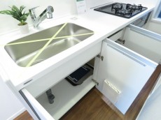 キッチンスペースはやや通路が狭い印象。このあたりの実際の感覚はご内見の時に確認されることをおすすめいたします。水栓は浄水機能付き、コンロは3口と設備は◎。