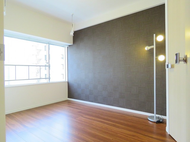 洋室は約5.5帖。壁面の一面にはダークブラウンのアクセントクロスが使われ、落ち着いた雰囲気になっています。