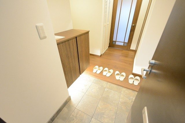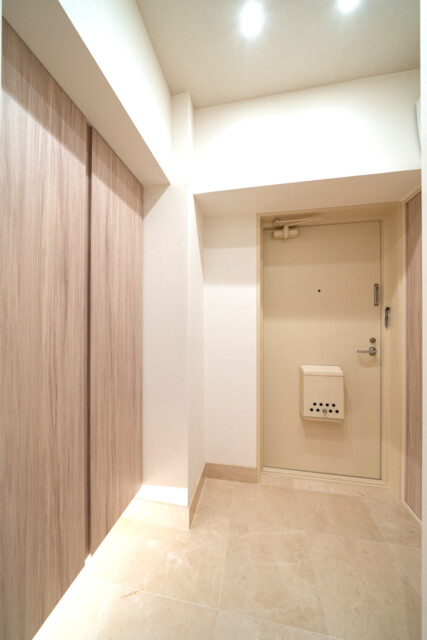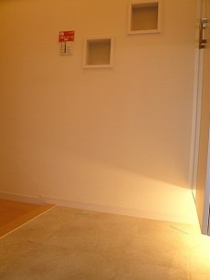 こちらが玄関スペースになります。ダウンライトがオシャレに照らされています。