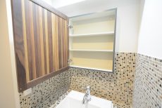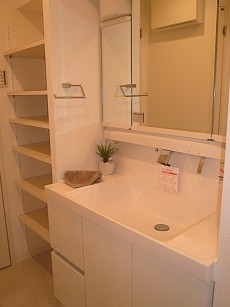 嬉しい収納こちらは、洗面台左側にあります棚です。タオルなど置けたら浴室から上がった時すぐ手にとれ便利ですね。