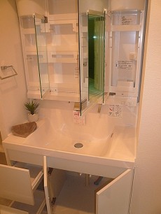 洗面台です。大きなミラーは三面鏡でみやすく、ウォッシュボウルも大きくオシャレでスタイリッシュなデザインです。収納もミラー裏はもちろん細かいものを置ける場所に、ウォッシュボウル下には扉付きと引き出しが2段あります。引き出しには毎日のセットに必要なドライヤーなどしまえたら良いですね。