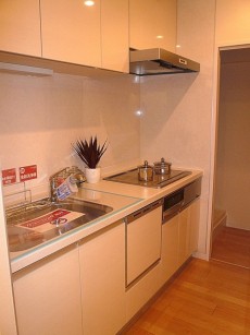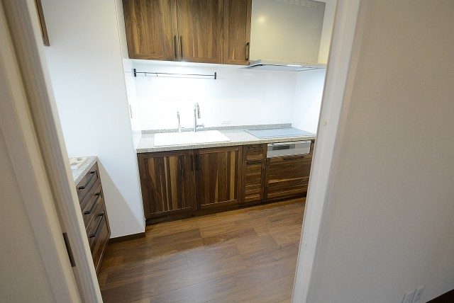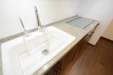 キッチンは場所をとらない壁付けタイプ。お部屋を広く使える一方でキッチン内が目立つというデメリットもあり、出来るだけ片付いた状態を保ちたいものです。キッチン自体は建具と揃いの木目を使うことでお部屋に上手く溶け込んでいますからね。コンロは人気のIH!炎が出ない安心とフラットトップの掃除しやすさが人気の理由です。食器洗浄乾燥機や浄水機能一体型水栓などのアシスト機能も充実していますよ♬