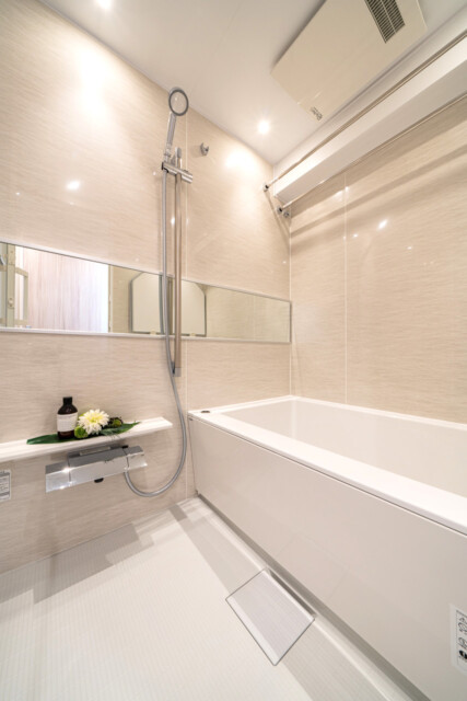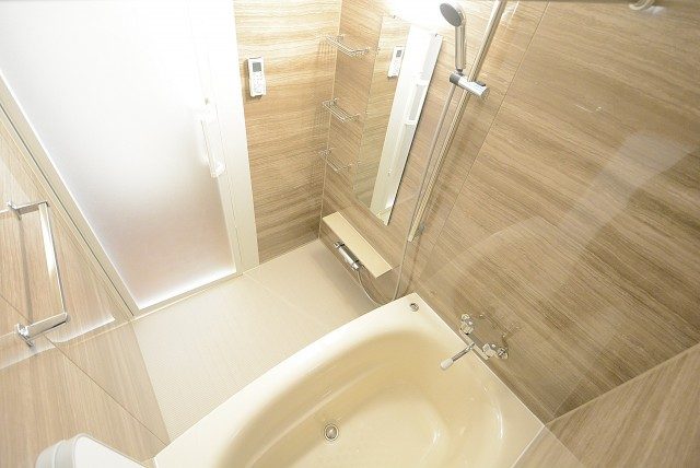浴室はお部屋との統一感を持たせたベージュのパネル使用。寛ぎの空間に相応しい落ち着いた雰囲気になっています。浴室換気乾燥機も付いているので、天気を気にせず洗濯機を回すことが出来ますよ。匂いが・・・と言う方もいらっしゃいますが、最近は室内干し用の洗剤などいろいろ発売されてますので是非お試しを!追い焚き機能付き。