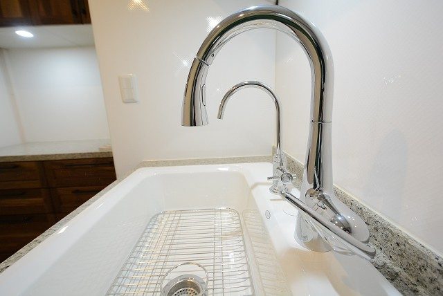 水栓は浄水機能付きです。小さな方の水栓から浄水がでてきますよ!!