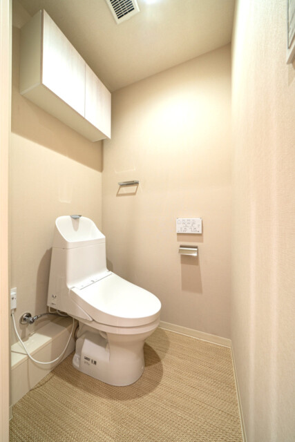 トイレはTOTO製の温水洗浄機能付き。トイレットペーパーのストックに便利な吊戸棚も付いています。