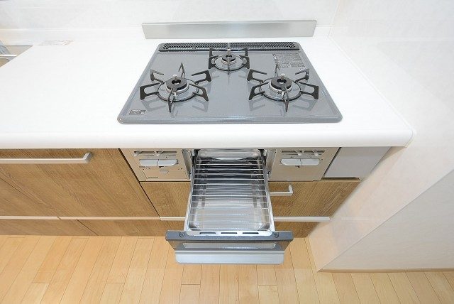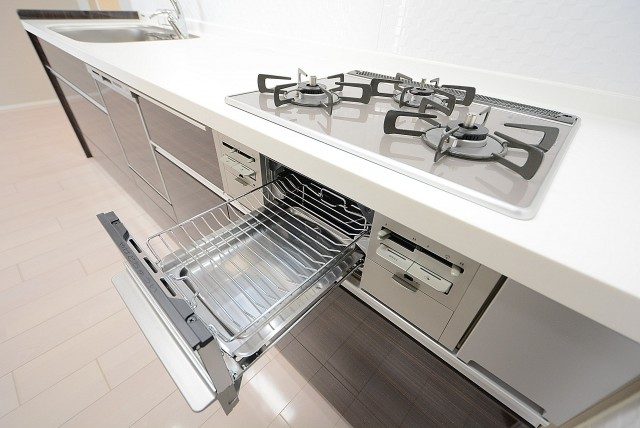大きなシンクが付いた水栓、3口のグリル付きガスコンロ、食器洗浄機といった設備があります。これだけあればもう十分ですね!?