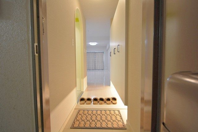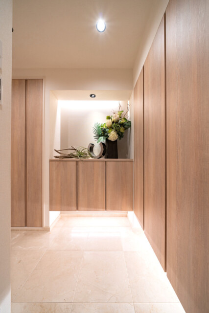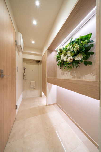 玄関から廊下にかけては高級感のある大理石貼り!暖色系なので温かみのある空間になっています。照明には人感センサーが付いているのでいつでも明るいお部屋が迎えてくれますよ。正面のニッチカウンターはセンスよく飾ってお客様をお出迎えしましょう!