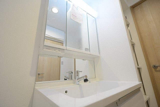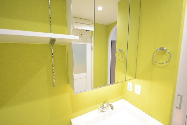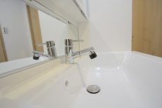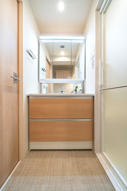 【洗面室:三面鏡付き洗面化粧台・洗濯機スペース】