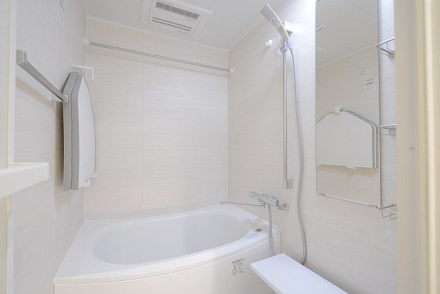 浴室は白をベースに温かみのあるベージュのパネルを使用したリラックス空間。追焚機能付きなのでいつでも温かいお風呂に入れますよ。浴室暖房や浴室衣類乾燥が可能な浴室換気乾燥機付き。