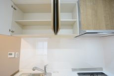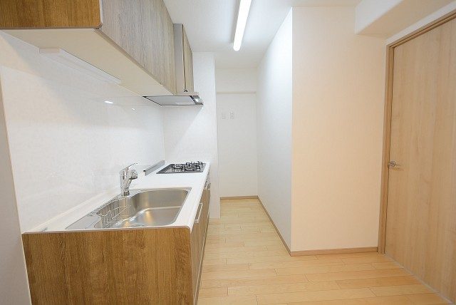 Ⅰ型のクローズドキッチンですね。ホワイト・ブラウンの色使いによって落ち着いた大人の雰囲気が漂っています。