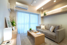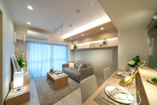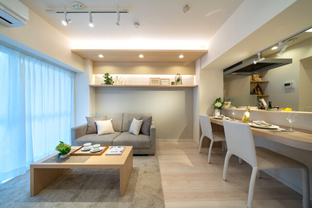 南向きバルコニーに面した明るいお部屋です。ナチュラルカラーでコーディネートされとても居心地がよさそうですね。天井や壁に設置された間接照明が立体感のある広がりを感じさせてくれます。