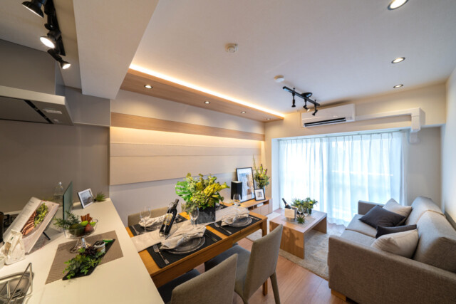 バルコニーに向かってキッチン、ダイニング、リビングと並んだオーソドックスなタイプなので、家具のレイアウトに悩むこともありません。ご家族構成やライフスタイルによって、ダイニングテーブルを少し小さくして大きめのソファーを置いたりなんかのアレンジも出来そうですね。こちらに置いてある家具は残念ながらディスプレイ用ですが、サイズや色、素材感などの参考にさせてもらいましょう!