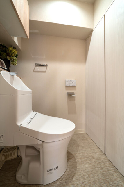 トイレはTOTO製の温水洗浄機能一体型。お気に入りの小物を飾ってインテリアを楽しめるニッチカウンターや、トイレットペーパーストックなどの収納に便利な吊り戸棚も付いています。ちなみに、写真右側の壁は扉になっていて中には電気温水器が鎮座しています。