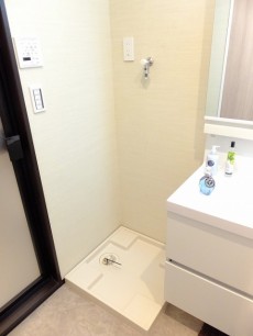 洗濯機置場は洗面台のすぐ隣。棚がないので、自作の吊り棚を作っちゃいましょう!!