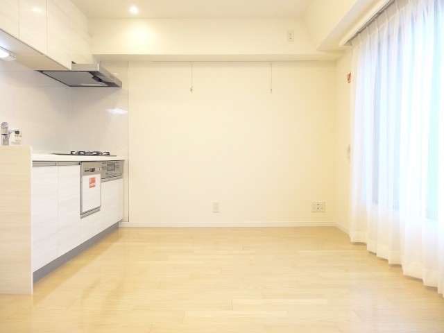 約9.3畳のダイニングキッチン。明るい色合いのツルツル&木目柄フローリングに白いクロスの明るい空間。どんなテイストの家具を置いても馴染みそうです。