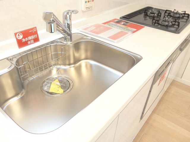 食洗機に浄水機能付き水栓、3口コンロとスペックもグー。お料理の支度も片付けもスムーズに進みそうです。システムキッチン左側のスペースに冷蔵庫が置けるようになっています。