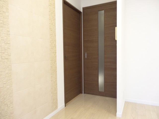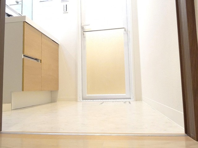 つづいて廊下に戻ってきて洗面室へ。入口入って左側に洗濯機置場と洗面化粧台、正面にバスルーム。
