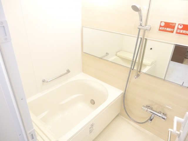 お部屋のフローリングと同じくナチュラルな色合いの木目柄パネルが使われた明るいバスルーム。追い焚きと浴室換気乾燥機能付き。暖房と涼風も入るので季節を問わず、快適なバスタイムがお過ごしいただけます。
