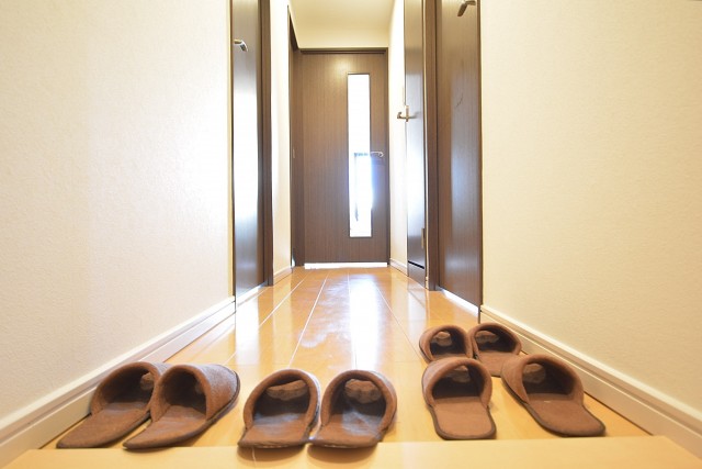 振り返って玄関の様子です。シューズボックスの横にはスペースがあって傘立てなんかが置けるようになっていました。ちょっとした事ですが、玄関を広く使えて助かるんですよね(^^)