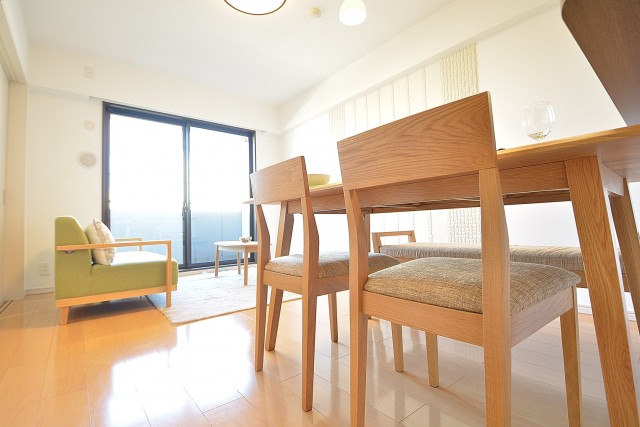 約9.0畳のリビングダイニング。家具が置いてあるので実際の生活イメージもつきやすいのではないでしょうか。4人がけのダイニングテーブルとソファを置いてちょうどよい広さです。