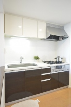 白とブラウンの2色使いのシステムキッチンは上下に収納もたっぷり。