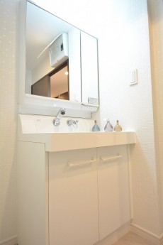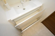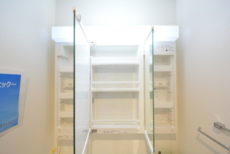 収納は洗面台下と三面鏡裏のキャビネット。細かい物が多くなりがちな洗面周りにはキャビネットが欠かせません。