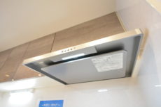上部には換気扇と吊戸棚。お料理中は換気扇をお忘れなく。