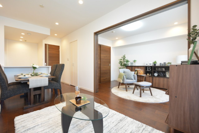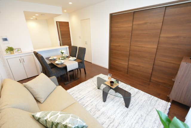 この様に、洋室をリビングの一部として使う事も可能です。大勢のお客様を迎えた時などに、こんな選択肢があるのはいですね。また、お部屋に余裕があれば普段から開けておいて約15帖のリビングを満喫できますよ♬
