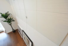 壁のアクセントウォールはただの飾りではありません。エコカラットといって室内の湿度を調節してくれたり、匂いを吸着してくれる素材で出来ています。ちょうど漆喰の様な機能ですね。