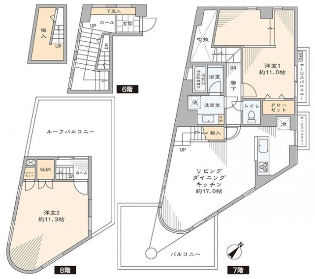 92.42㎡ 2LDK の3階建てメゾネットタイプで、18㎡のルーフバルコニーが付いています☆