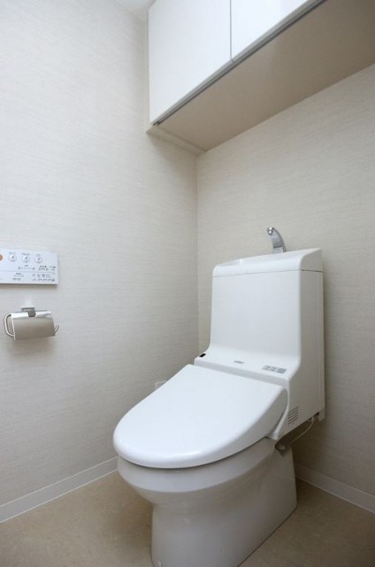 その隣にはトイレがありました。吊り棚があるので収納もキレイにできそうですね~(^v^)