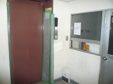 こちらがエントランス内です。正面にエレベーターがあり、エレベーター右側に管理室、左側は内階段になります。