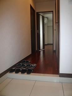 ドアをあけますとタイル張りの玄関スペース、真新しい景色からは柔らかい光がみえ~無垢材使用の廊下からは暖かさを感じます。左側にはシューズインクローゼットがあります。